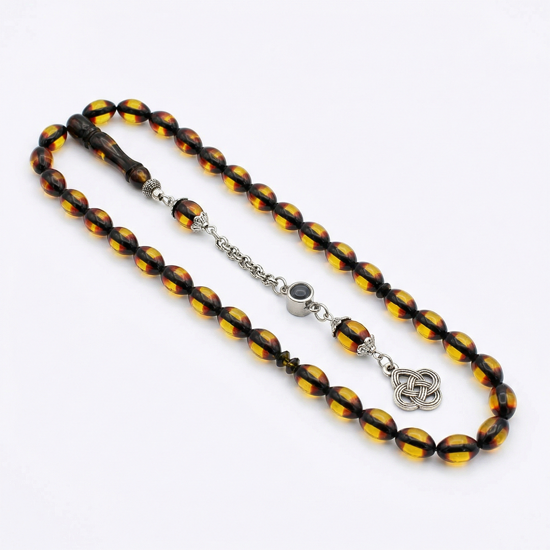 %100 doğal kehribar tanelerinden üretilmiştir. Her tane, milyonlarca yıl önce fosilleşmiş ağaç reçinesidir ve benzersiz doğal dokusuyla öne çıkar. Gümüş detaylar ve özel işçilikle tamamlanır.
