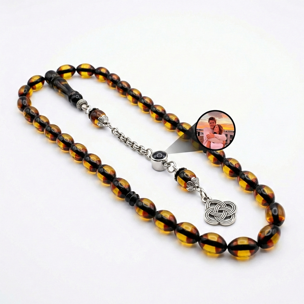 Kişiye Özel Fotoğraflı Bal Rengi Kehribar Tesbih